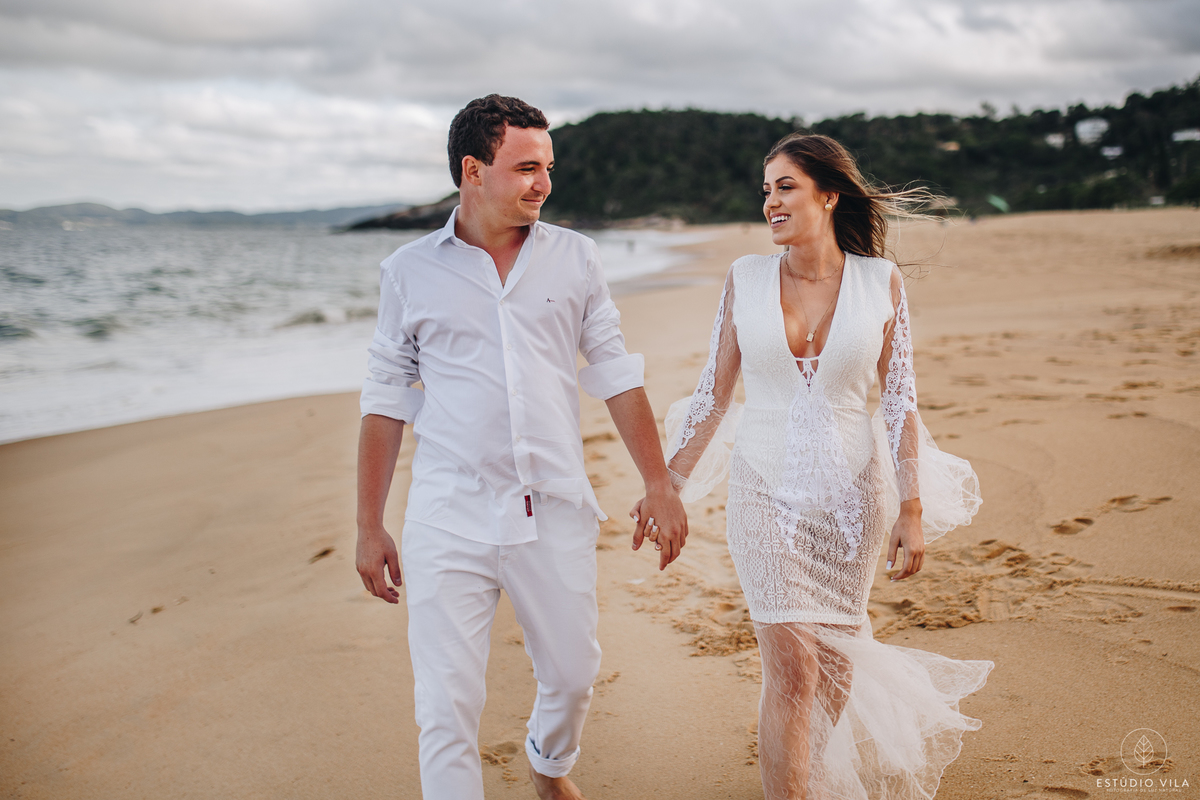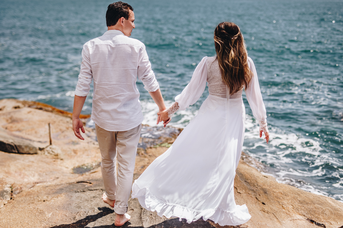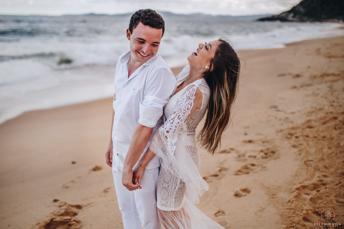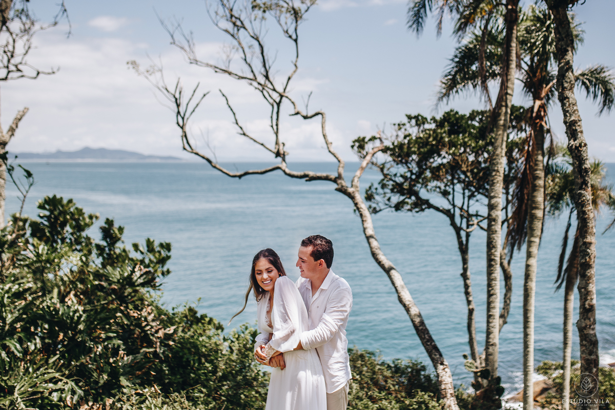 Para esse ensaio, nos encontramos às 7 da manhã e fomos direto para Praia da Sepultura em Balneário Camboriú/SC, o dia estava lindo com direto a um céu bem azulzinho e um sol beeem quente kkk. A Nath usou em seu primeiro look um vestido fluído com detalhes em renda, que trouxe todo um charme e delicadeza para as fotos, e fizemos varias cliques incríveis em meio as pedras. Depois entramos em uma aventura e pegamos um trilha para conseguir chegar ao outro lado da ilha, com uma subidinha nada leve, mas que valeu a pena pois fizemos lindas filmagens com o drone, além de fotos maravilhosas do casal, que estava super animados. Depois de todaa essa aventura e essa manha maravilhosa ao lado do casal, nada como um almoço para repor as energias e seguir para o próximo destino. Para finalizar o ensaio, fomos até a Praia do Estaleiro, onde a Nath usou um vestido mais leve, em renda e tule e fizemos lindos registros do casal na areia e no mar. Registros esses que vão ficar na memória