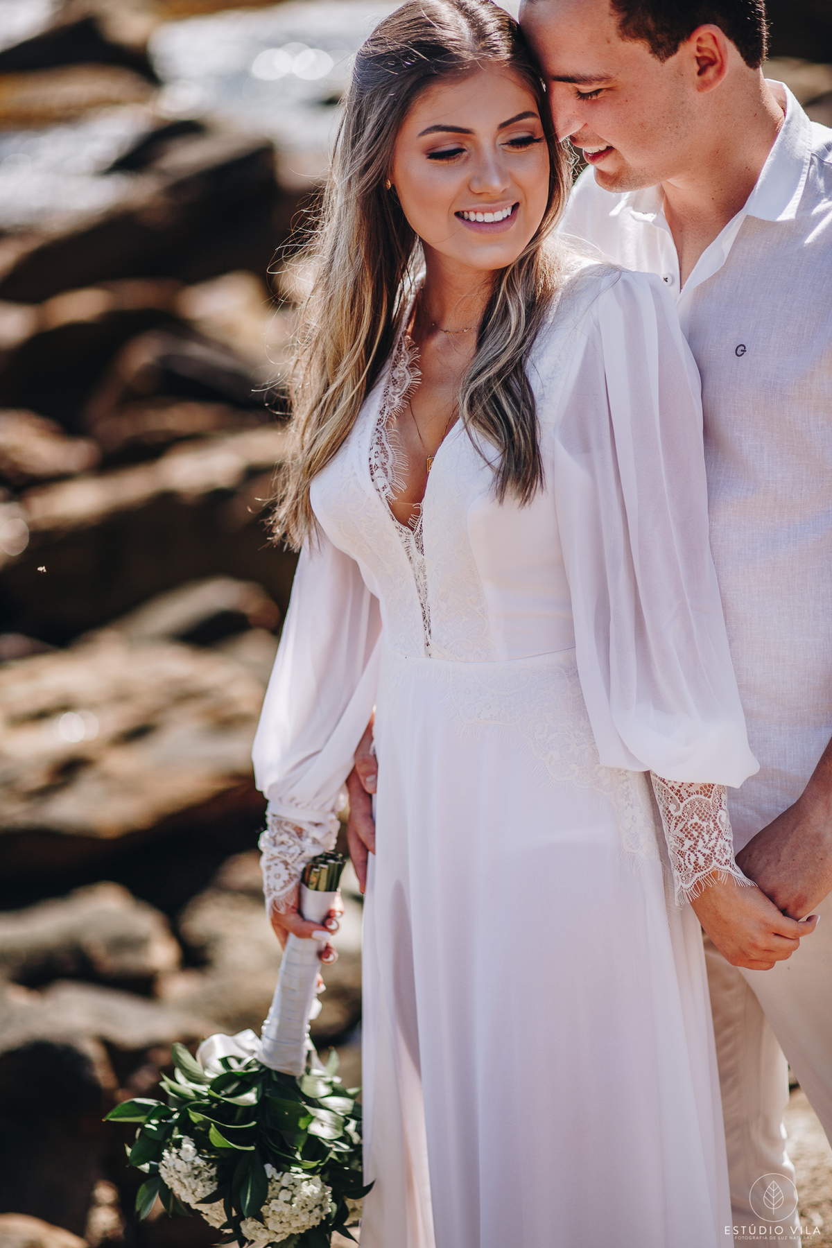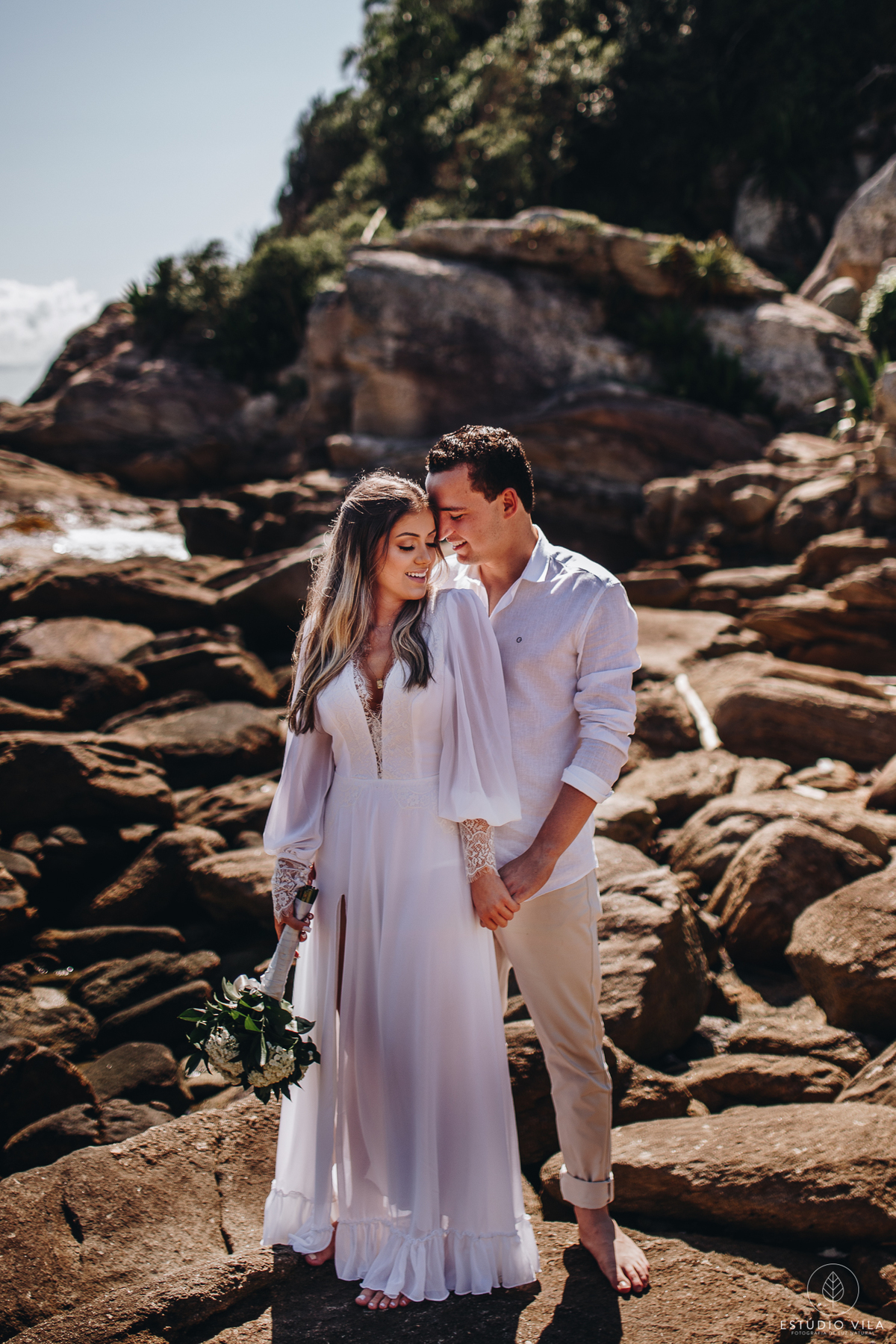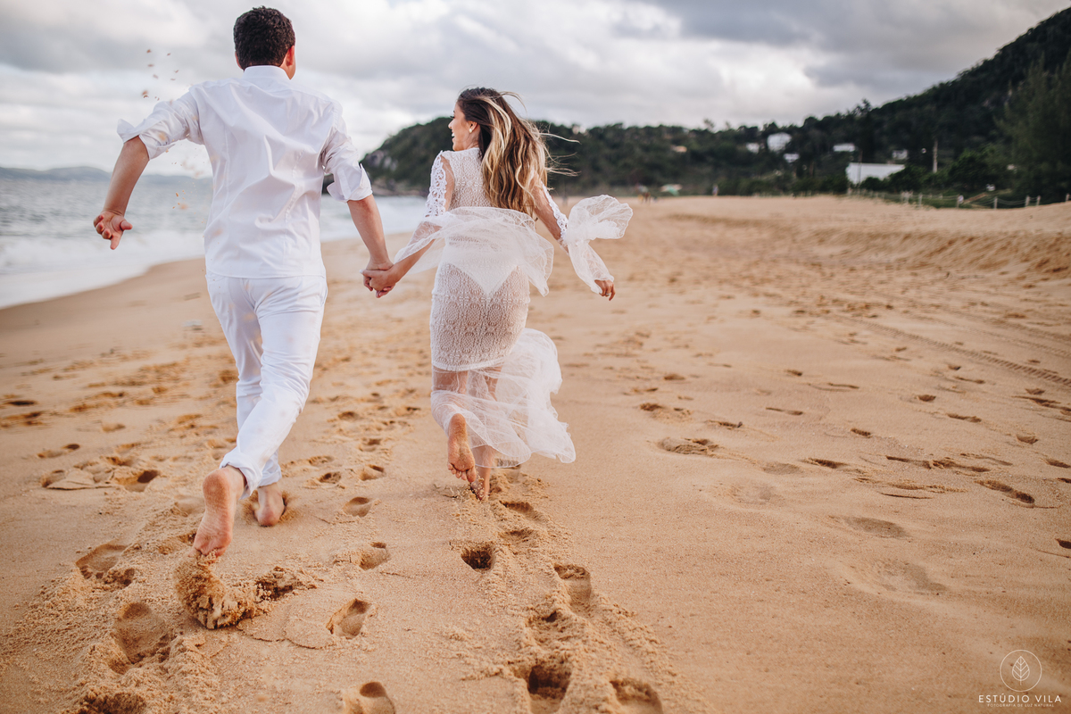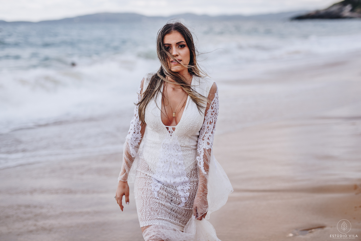 Para esse ensaio, nos encontramos às 7 da manhã e fomos direto para Praia da Sepultura em Balneário Camboriú/SC, o dia estava lindo com direto a um céu bem azulzinho e um sol beeem quente kkk. A Nath usou em seu primeiro look um vestido fluído com detalhes em renda, que trouxe todo um charme e delicadeza para as fotos, e fizemos varias cliques incríveis em meio as pedras. Depois entramos em uma aventura e pegamos um trilha para conseguir chegar ao outro lado da ilha, com uma subidinha nada leve, mas que valeu a pena pois fizemos lindas filmagens com o drone, além de fotos maravilhosas do casal, que estava super animados. Depois de todaa essa aventura e essa manha maravilhosa ao lado do casal, nada como um almoço para repor as energias e seguir para o próximo destino. Para finalizar o ensaio, fomos até a Praia do Estaleiro, onde a Nath usou um vestido mais leve, em renda e tule e fizemos lindos registros do casal na areia e no mar. Registros esses que vão ficar na memória